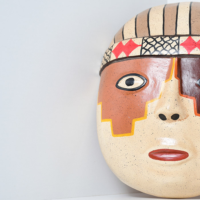 Descripción/ característica | Objeto cerámico decorativo, sirve para colgar en el parad, representa a los guerreros wari. Los colores predominantes son el blanco, marrón y rojo.